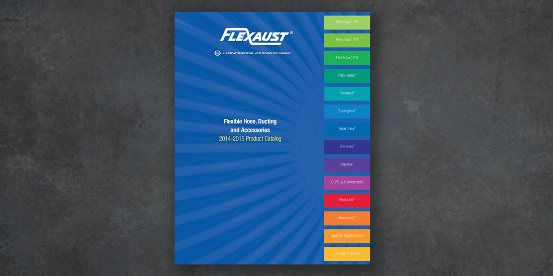 Flexaust, the largest manufacturer of industrial hoses and ducting in the United States, had recently acquired a company that manufactured fittings. The Flexaust catalog had not been revised in several years, and this was the ideal opportunity to streamline the unwieldy catalog’s format and update the look. In addition, we created an ad conveying that the combined product line delivers greater value to customers.