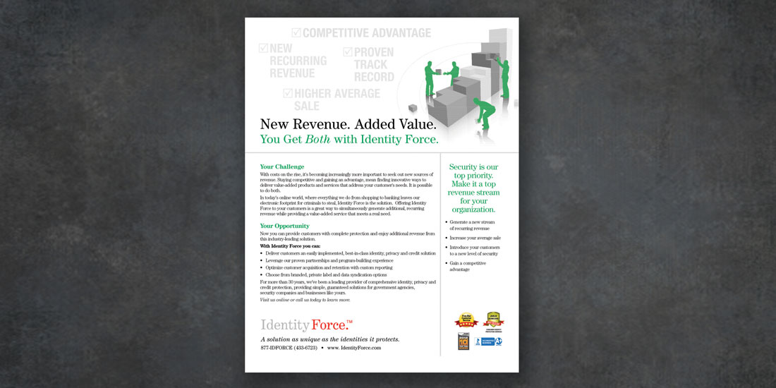 This identity, privacy, and credit protection company offered an interesting set of branding challenges. IdentityForce often partners with other companies, such as Verizon, requiring ongoing adjustments to meet co-branding and brand identity guidelines. This required strong management skills, client communication, and great attention to detail. Our work with IdentityForce included exhibit graphics, for end-users, resellers, and exhibit-goers.