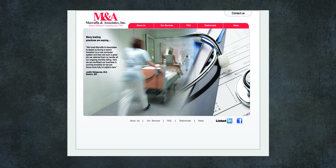 dehaas2021-10-15T17:33:09-04:00The homepage for Marraffa's redesigned website functions as an online brochure for this medical industry billing company. The blurred image reflects the high energy of medical environments and high-speed nature of their clients' organizations. The homepage features rotating testimonials to convey credibility and trust. www.marraffa.com